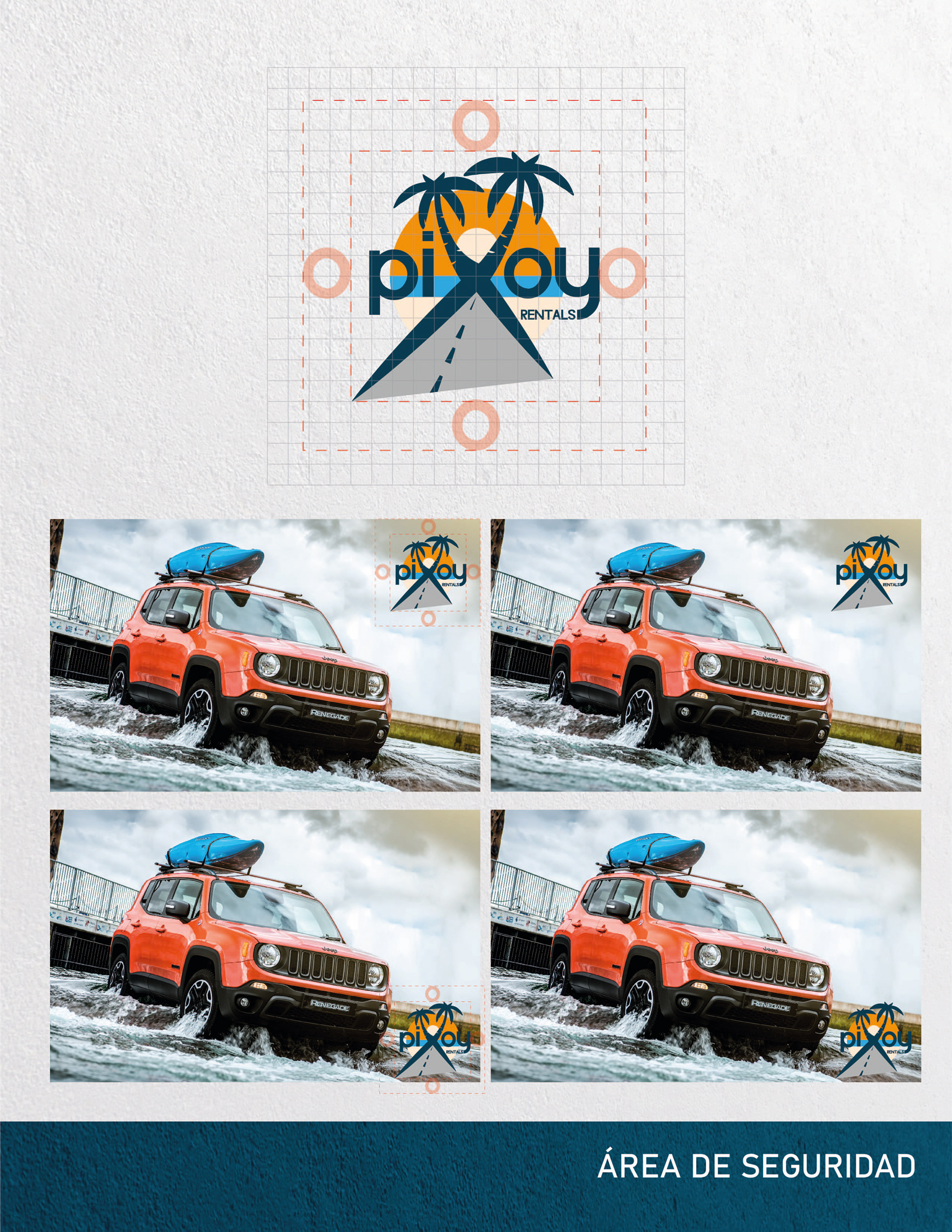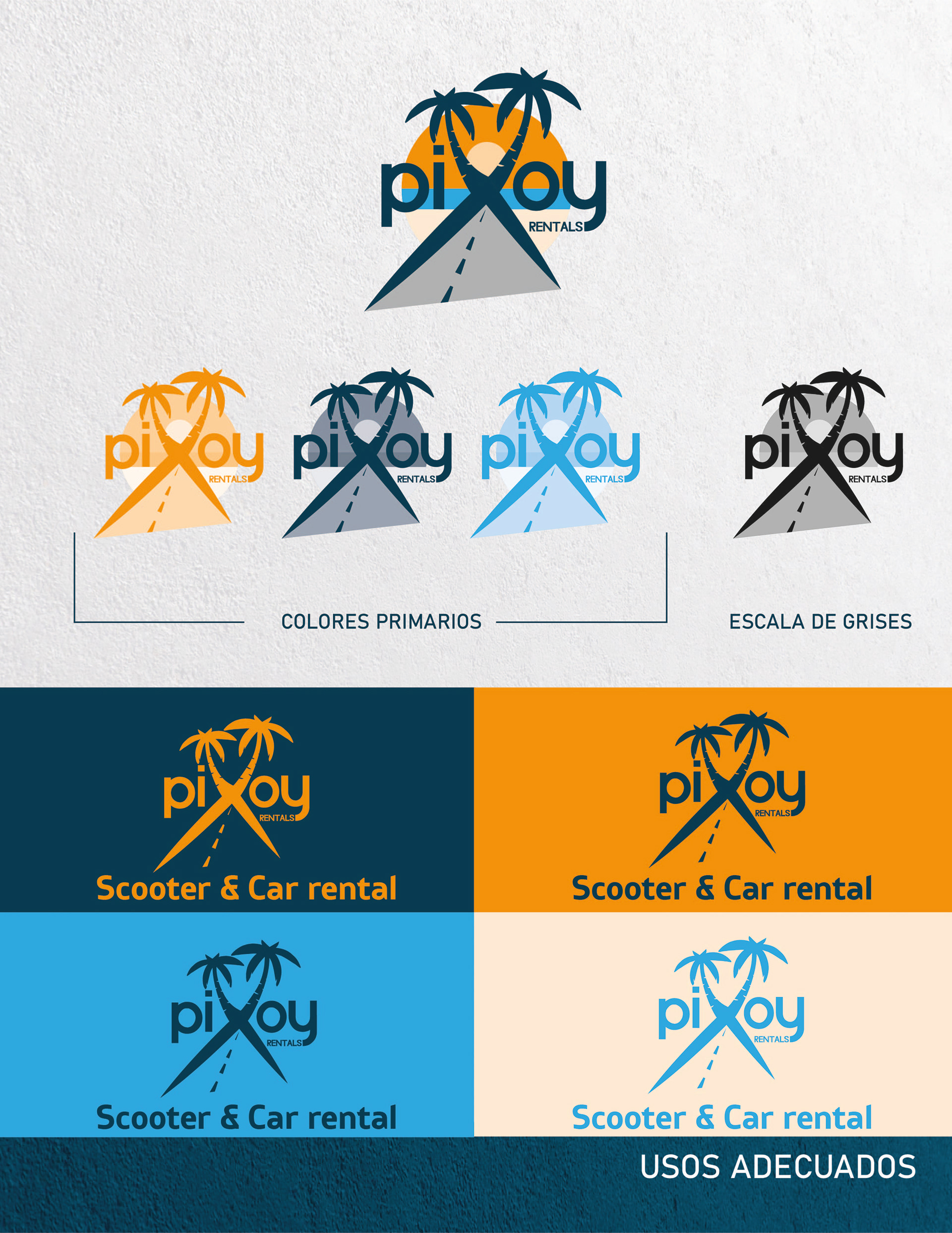 We define that the central elements that identify Pixoy Rentals are: the "X", the beach (sand, sea, sun and palm trees), these elements are a fundamental part for the construction of this new image. Taking advantage of these elements, we decided to annex the “road”, which makes direct reference to the services that Pixoy Rentals offers to its target audience.